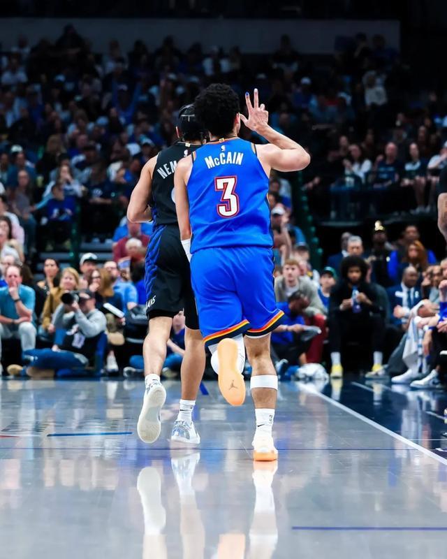 前两天雷霆加时战胜掘金的比赛后,切特-霍姆格伦这么评价拿到14分的新队友麦凯恩。那场比赛,麦凯恩8投6中,三分3中2,关键第四节拿到了8分。